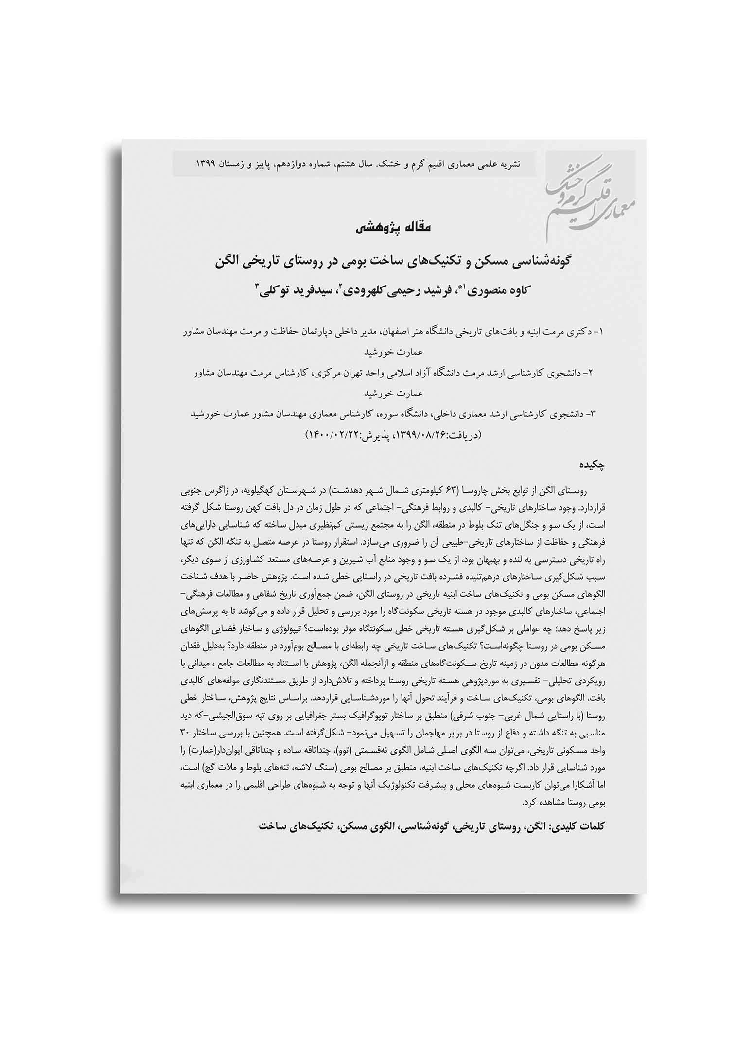 گونه شناسی مسکن و تکنیکهای ساخت بومی در روستای تاریخی الگن؛ نشریه اقلیم معماری گرم و خشک؛1400